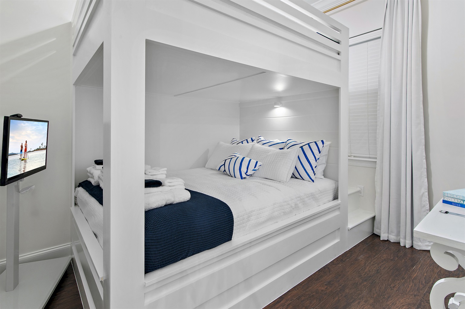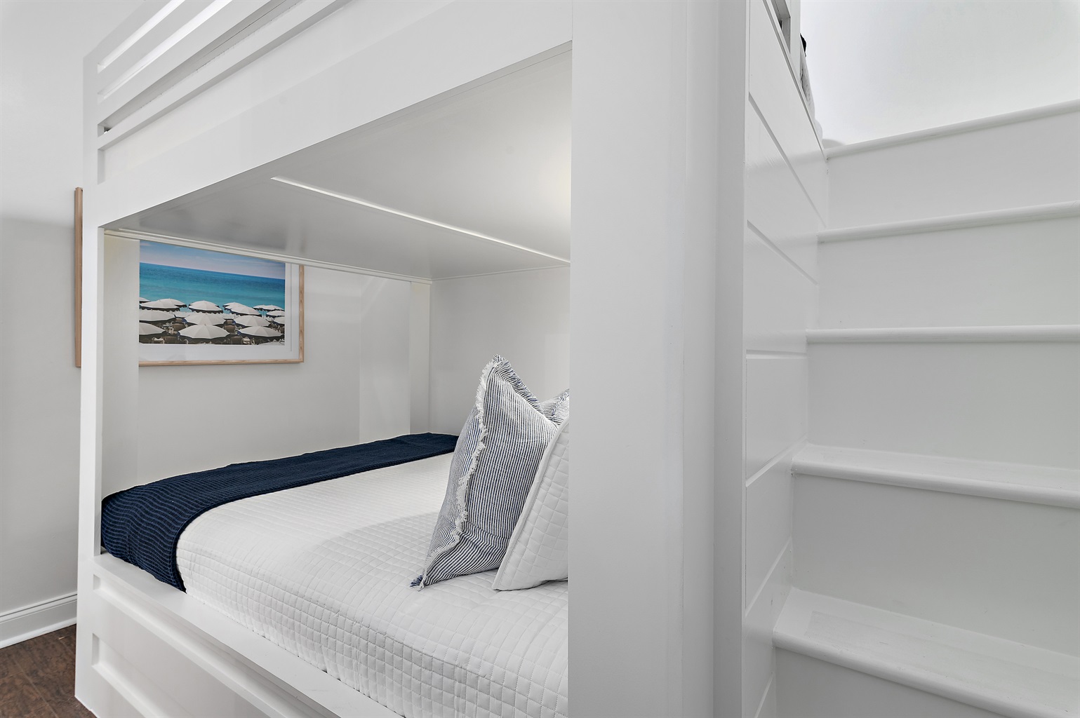 Designed with a modern coastal style, the space is bright, inviting, and fully equipped for relaxation. The open living area features new seating for gathering after the beach, while the kitchen is stocked with everything you need, from cookware to wine glasses and a Keurig.The master bedroom has a new king bed, fresh linens, a smart TV, and plenty of storage. The guest room offers custom queen-over-queen bunks with built-in stairs—great for both kids and adults. The renovated bathroom includes a brand-new shower, vanity, and toilet.